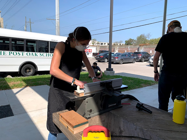 Today was the last day of the Advanced Woodworking A-term and for us seniors the last day of Post Oak J/A Terms as a whole... On another note, I finally finished my cutting board! I had to veer a little from the original design but all in all, I am very happy with the final product and learned a lot in the process. I started the day by gluing the handle back onto the cutting board with the longer clamps at school. This glue-up called for an additional extremely long waiting period for the glue to dry. Since I couldn’t finish my project just then I spent the morning roaming around the Tinkeria, watching Sutton try to saw off the excess wood from her project, and even started making the A-Term Presentation slides in an attempt to make the glue dry faster. By the time we finished our lunch break, my cutting board was dry enough for the next step. Recalling yesterday’s incident, I hesitantly approached the router again. Mr. Grisbee wisely decided to stand on the left side of the router thi...